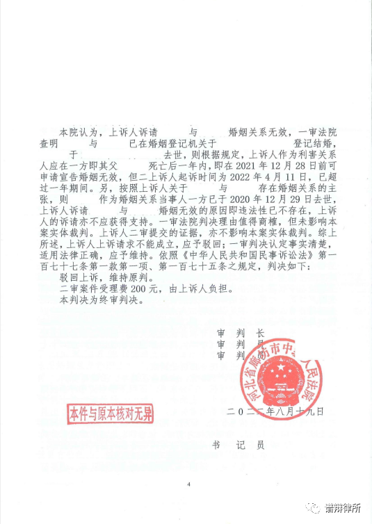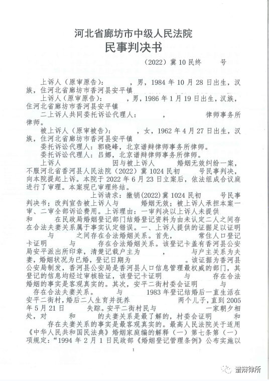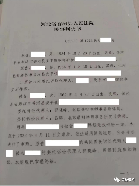 近日,郭晓峰主任、吕娜律师代理的婚姻无效案件一审、二审阶段均胜诉。因涉及当事人隐私,具体案情不再描述。