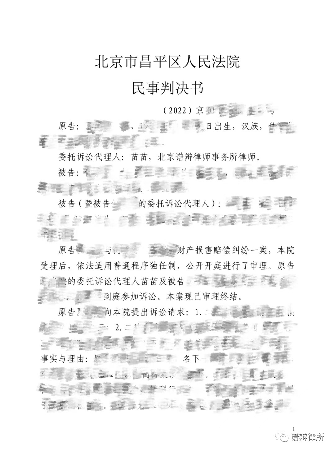 2023年10月12日,北京谱辩律师事务所苗苗律师代理的财产损害赔偿纠纷收到胜诉判决。