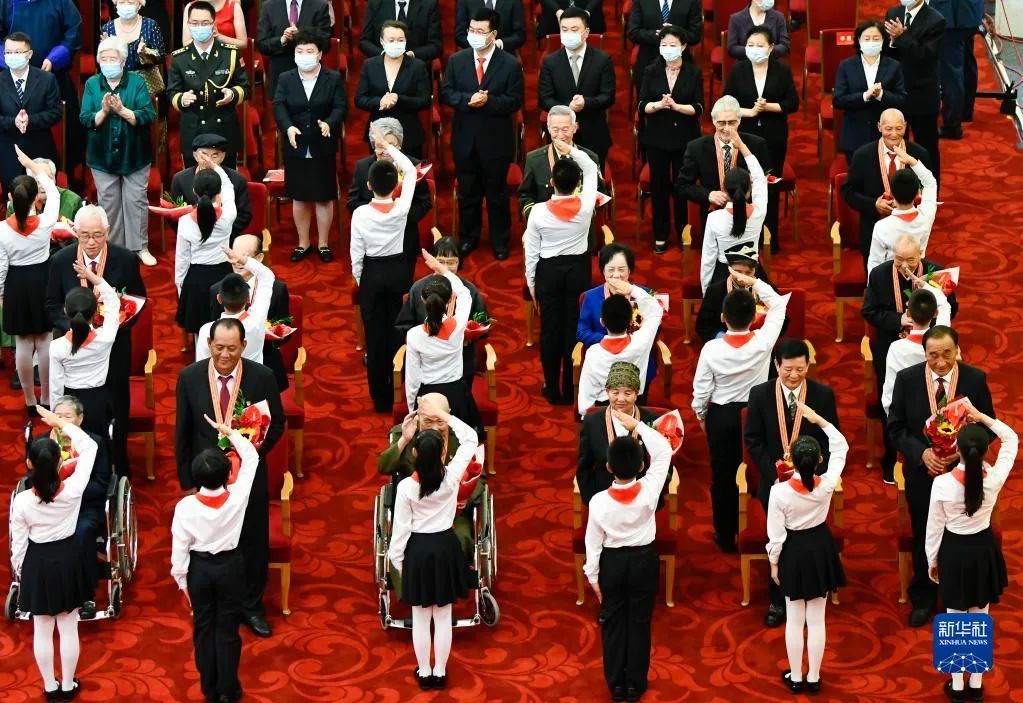 2021年6月29日,庆祝中国共产党成立100周年“七一勋章”颁授仪式在北京人民大会堂金色大厅隆重举行。这是少先队员向勋章获得者献花,敬礼致意。新华社记者 高洁 摄