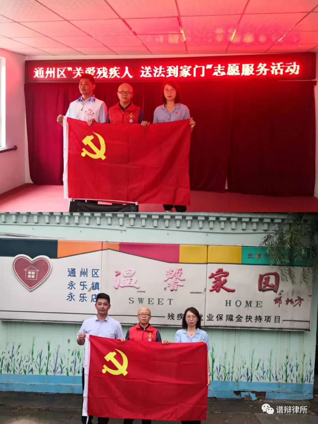 同时,本次助残扶残活动也是谱辩党支部的一次志愿服务活动,活动结束后,谱辩党支部的党员律师们与党旗合影留念。